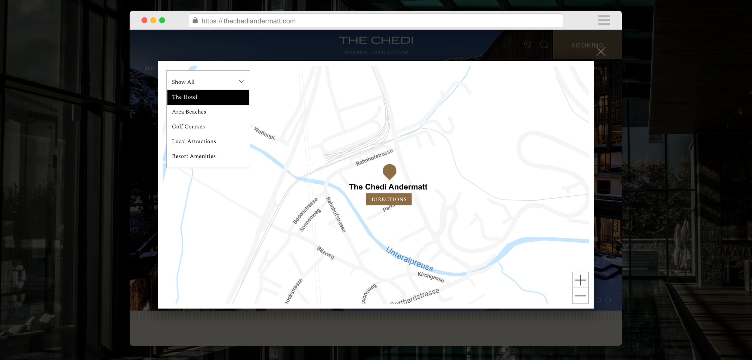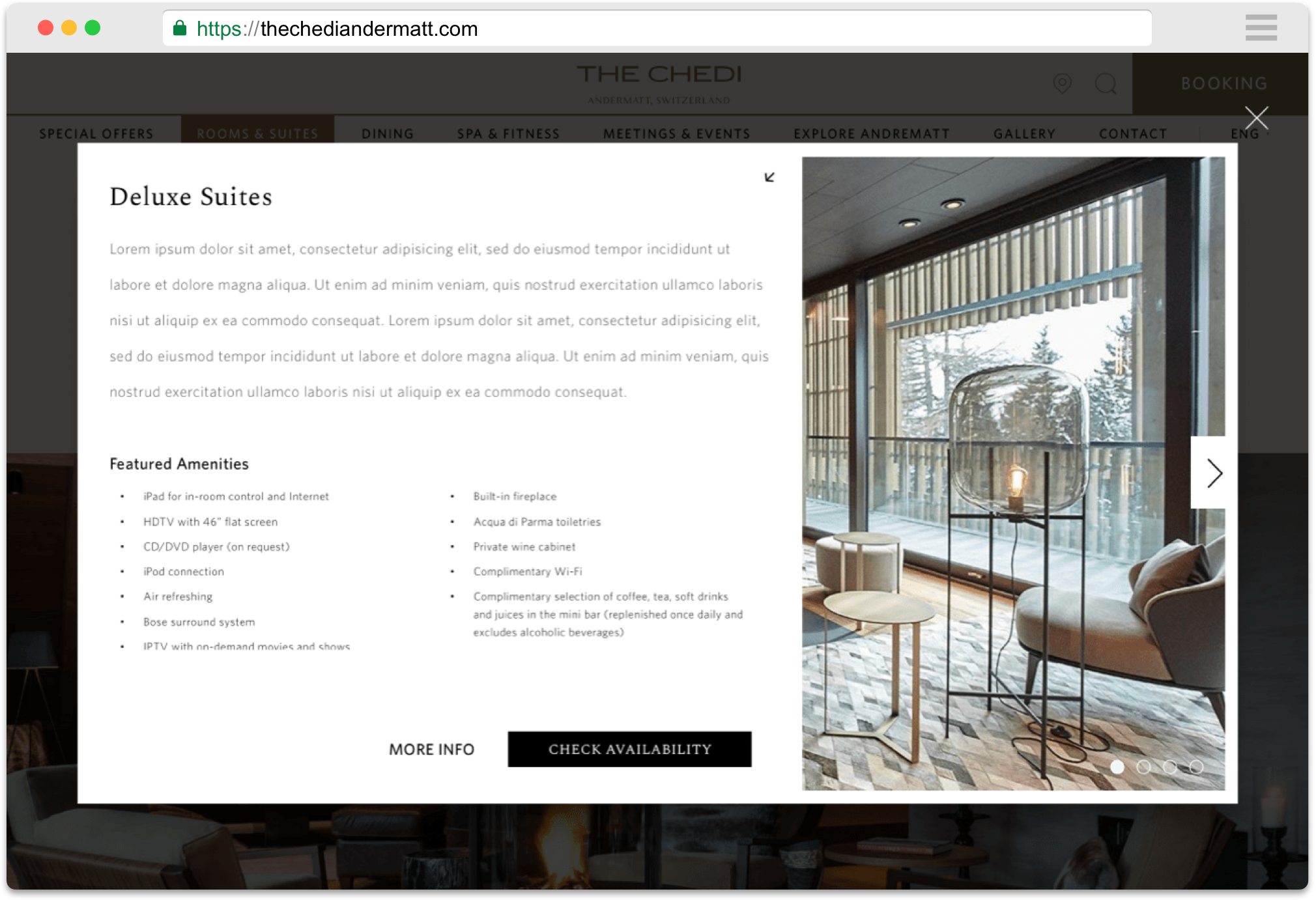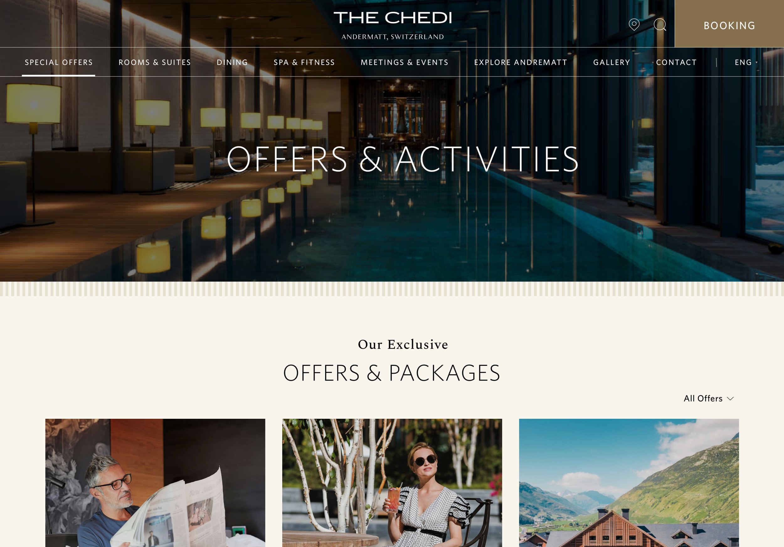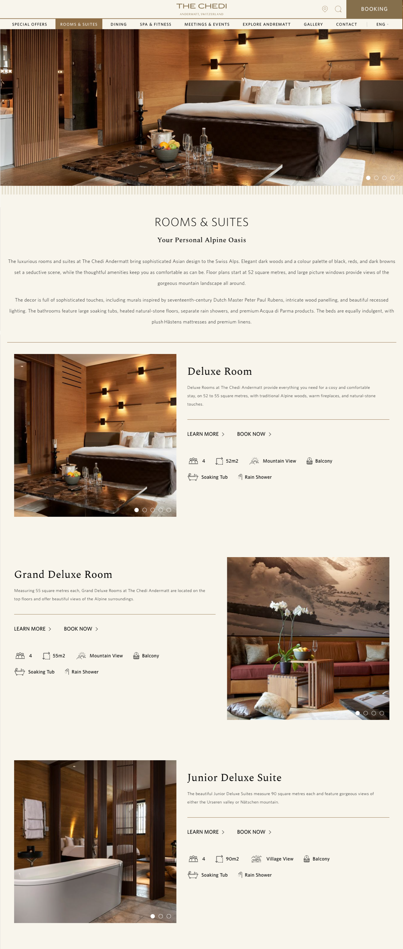 One of the more important project goals was to showcase Chedi Andermatt’s incredible accommodations. Leveraging their stunning photography with thoughtful language, the listing for each room type both inspires and informs.